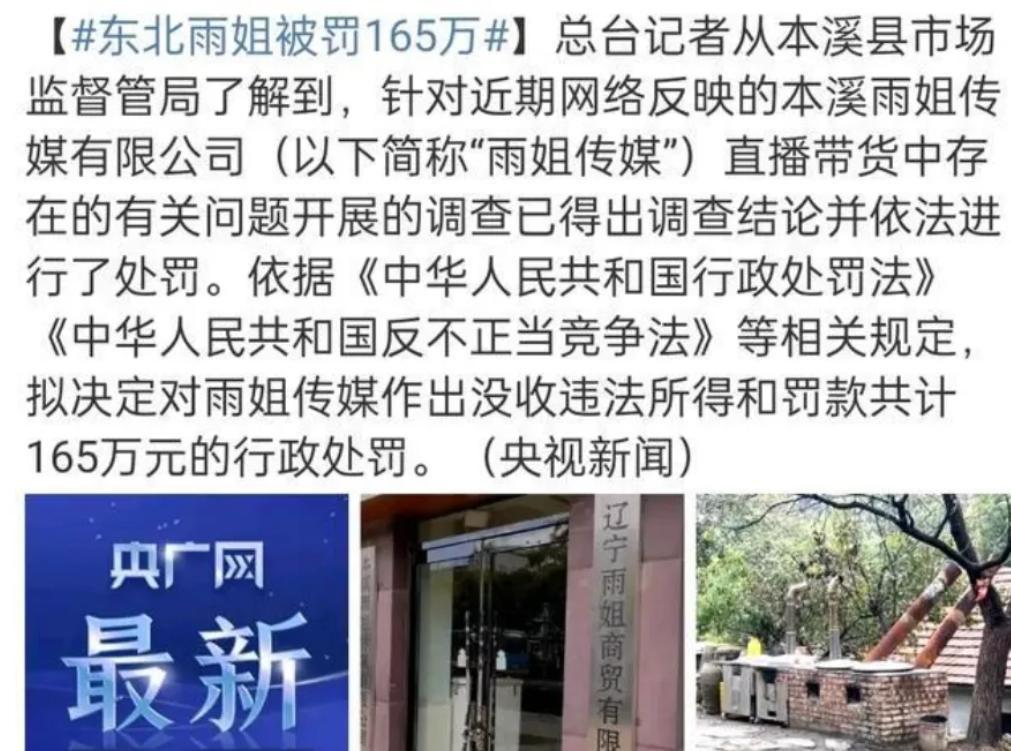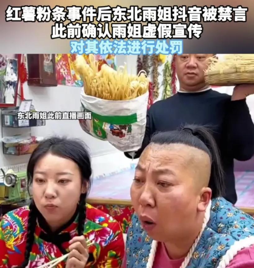 国庆长假刚过,有关部门就公布了检测结果,认定东北雨姐直播间宣传的红薯粉条,没有检测出红薯成分,而是只有木薯成分,最终东北雨姐及其背后的公司因为涉及虚假宣传,被没收违法所得和罚款共计165万元。